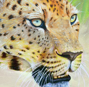 I decided to make just a couple of adjustments for my painting: the canvas I had selected for my first crack was just 12"x10", so I cropped the image a little closer to the face. I also lowered the eyelids slightly to soften the leopard's gaze, whilst keeping their intensity.
