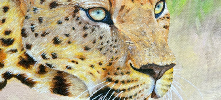 But what to paint? After painting plants for a whole year, I was dying to get back into wildlife art and big cats were a no-brainer for me. I scoured the internet for inspiration and stumbled across a Flickr account from a photographer who makes all his images open for use under a creative commons licence. I was struck by one image of an African leopard, which had real intensity and was complex enough a subject to be interesting to paint without being too adventurous for my first go at a new medium (and, again, not having painted an animal on canvas for about 12 years!)